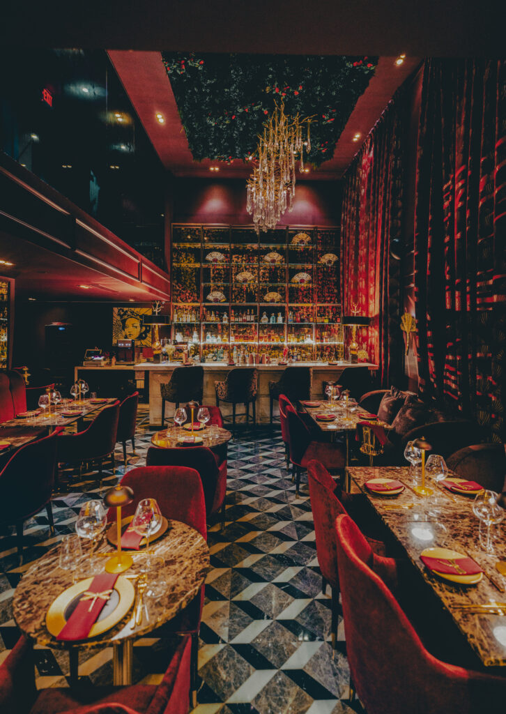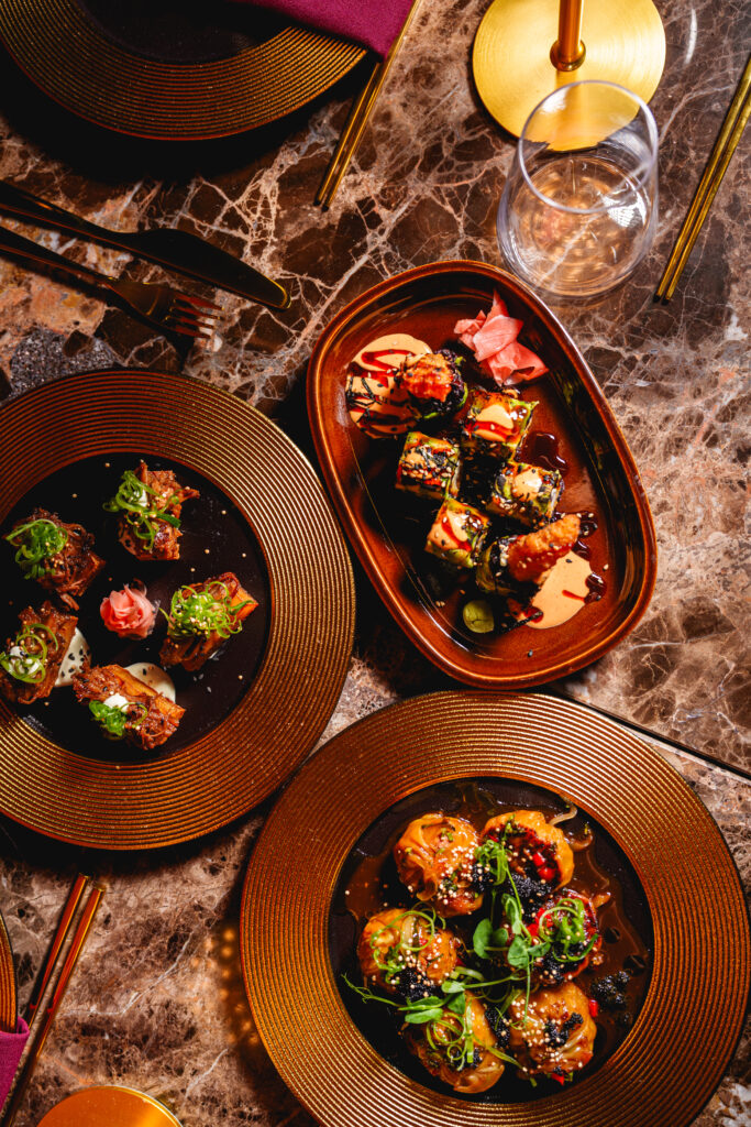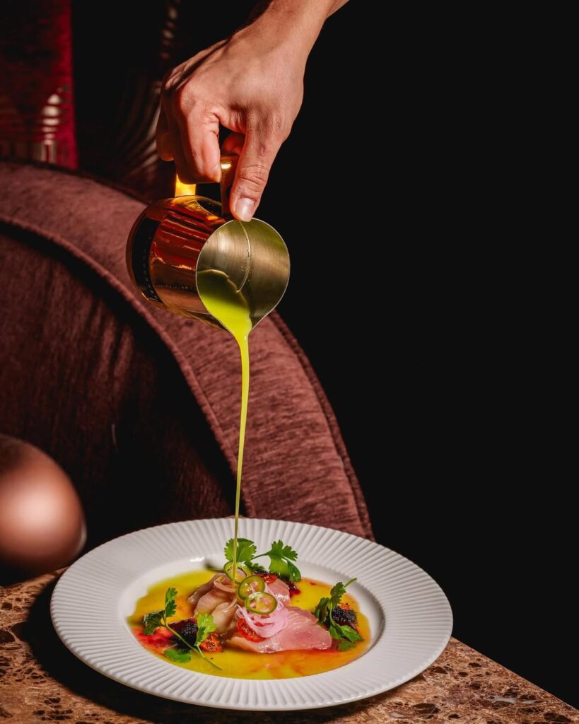 Desde el primer momento, DRGN se presenta como mucho más que un restaurante. Su diseño escénico —marcado por una sensual paleta de tonos borgoña, elegantes dorado y negro, lámparas escultóricas, espejos cuidadosamente ubicados y un mobiliario elegante— crea una atmósfera envolvente donde el lujo contemporáneo dialoga con referencias claras a la estética asiática. El espacio funciona como un verdadero escenario sensorial, pensado para impactar visualmente y acompañar la propuesta culinaria.