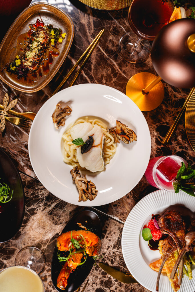 La experiencia DRGN se completa con platos que demuestran la versatilidad del concepto, como el Sea Bass al Vapor con udon noodles en caldo shiro y ajo negro; las Robata Colorado Lamb Chops, inspiradas en técnicas japonesas; el Seared Bluefin Tuna con kombu sauce y tobiko; y el Kāo Churrasco, una fusión asiática-latina que reinterpretó un clásico local. La sección vegetal también tuvo un rol protagónico, con preparaciones como Ginger Scallion Amarillos, Lotus Root & Mushrooms, Crispy Eggplant y el Brussel Sprout Okonomiyaki.