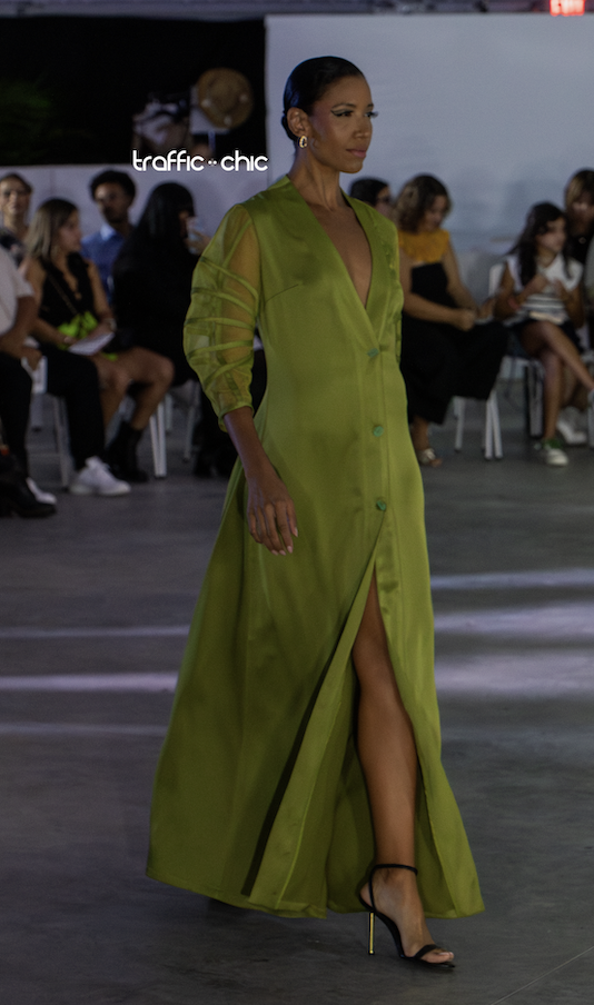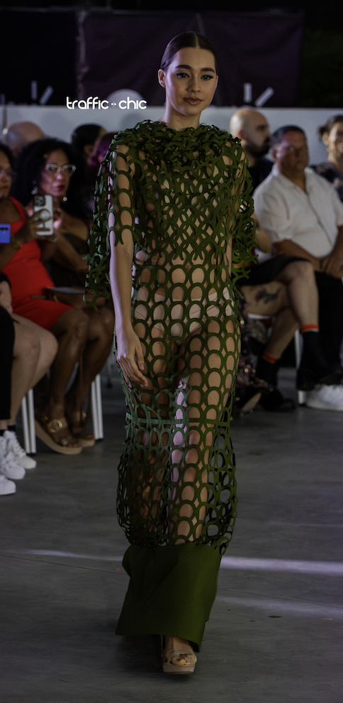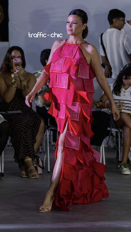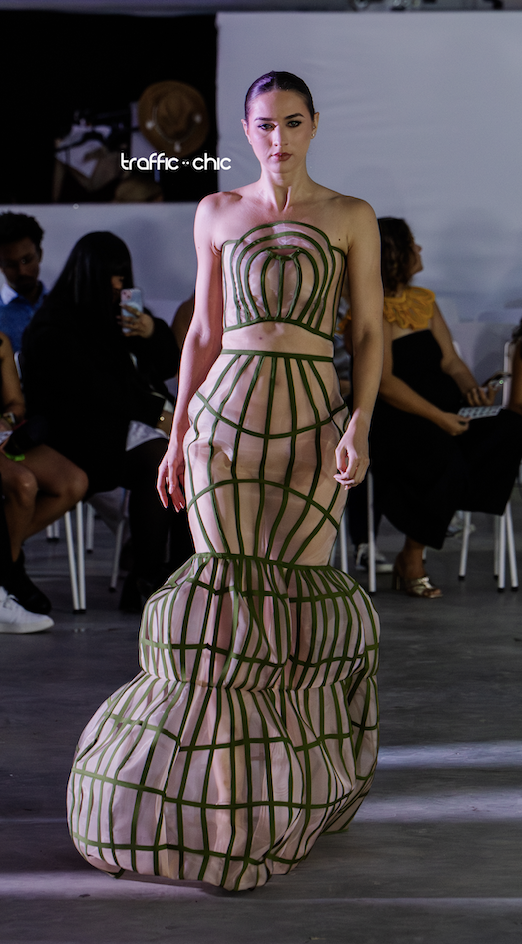 Las siluetas —modernas, fluidas y cargadas de actitud— reflejan la estética inconfundible de Cabán. Transparencias estratégicas, cortes que enmarcan el cuerpo y una feminidad atrevida se entrelazan con elementos gráficos que evocan el juego: tómbolas, chapas circulares y formas geométricas que aparecen como guiños sofisticados a su historia familiar. Más que una referencia literal, el diseñador crea un lenguaje visual propio donde cada pieza narra un pedazo de memoria.