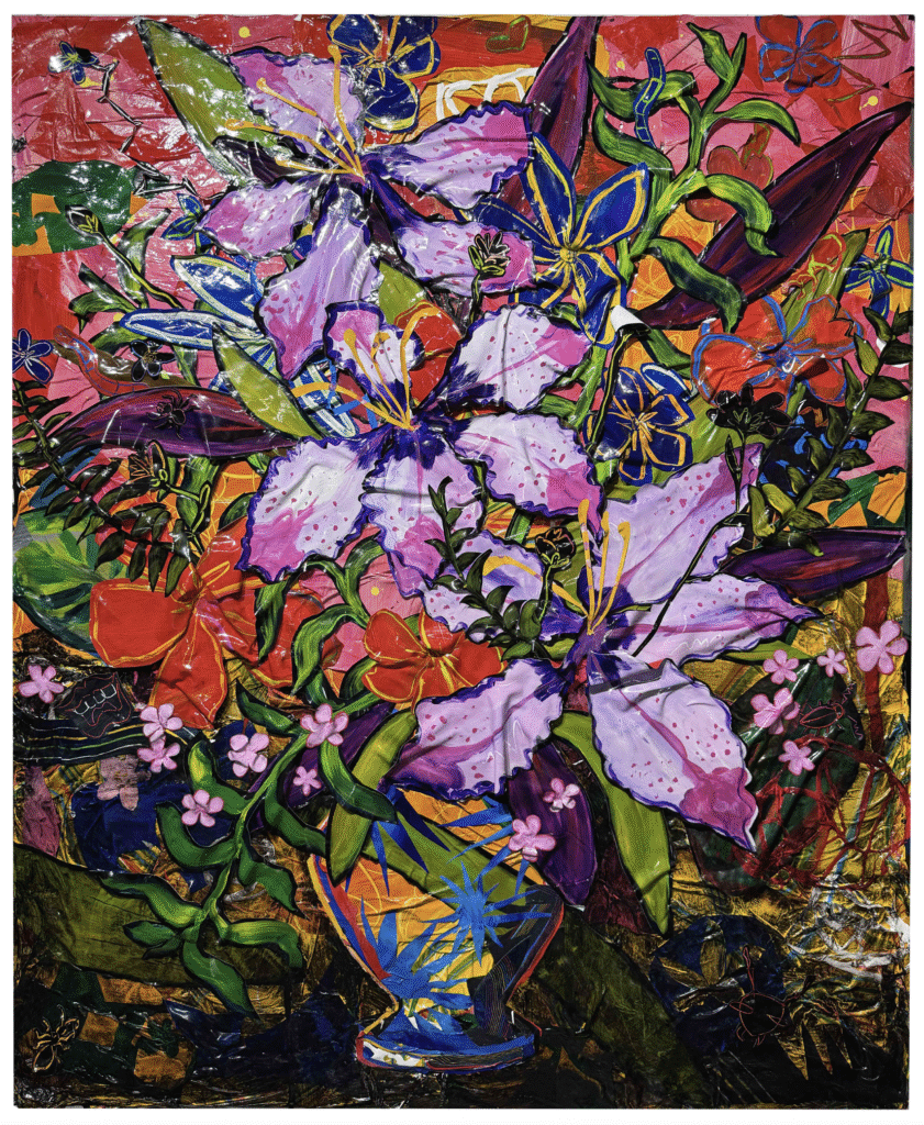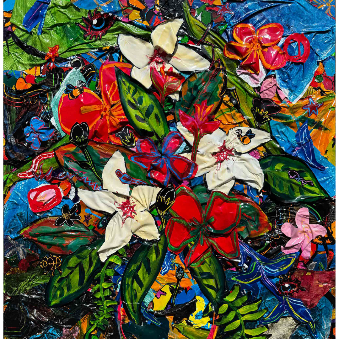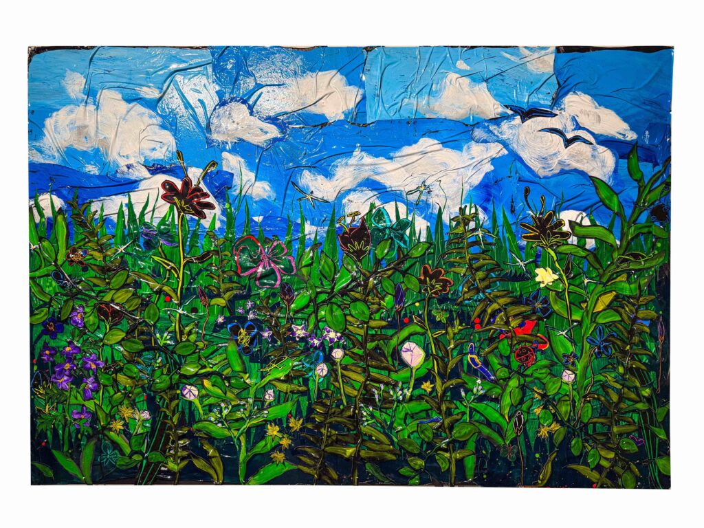 “Flor silvestre” reúne una serie de obras de gran formato creadas mediante una técnica experimental de “piel de acrílico”, donde Feba combina capas, texturas y transparencias para construir un lenguaje visual propio. En sus lienzos, flores, insectos y formas orgánicas se convierten en símbolos de resistencia y belleza natural, un reflejo de la fuerza vital que habita en lo cotidiano.